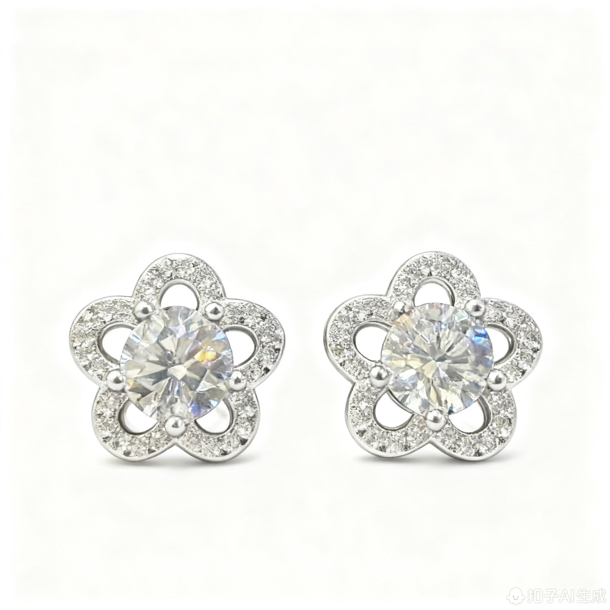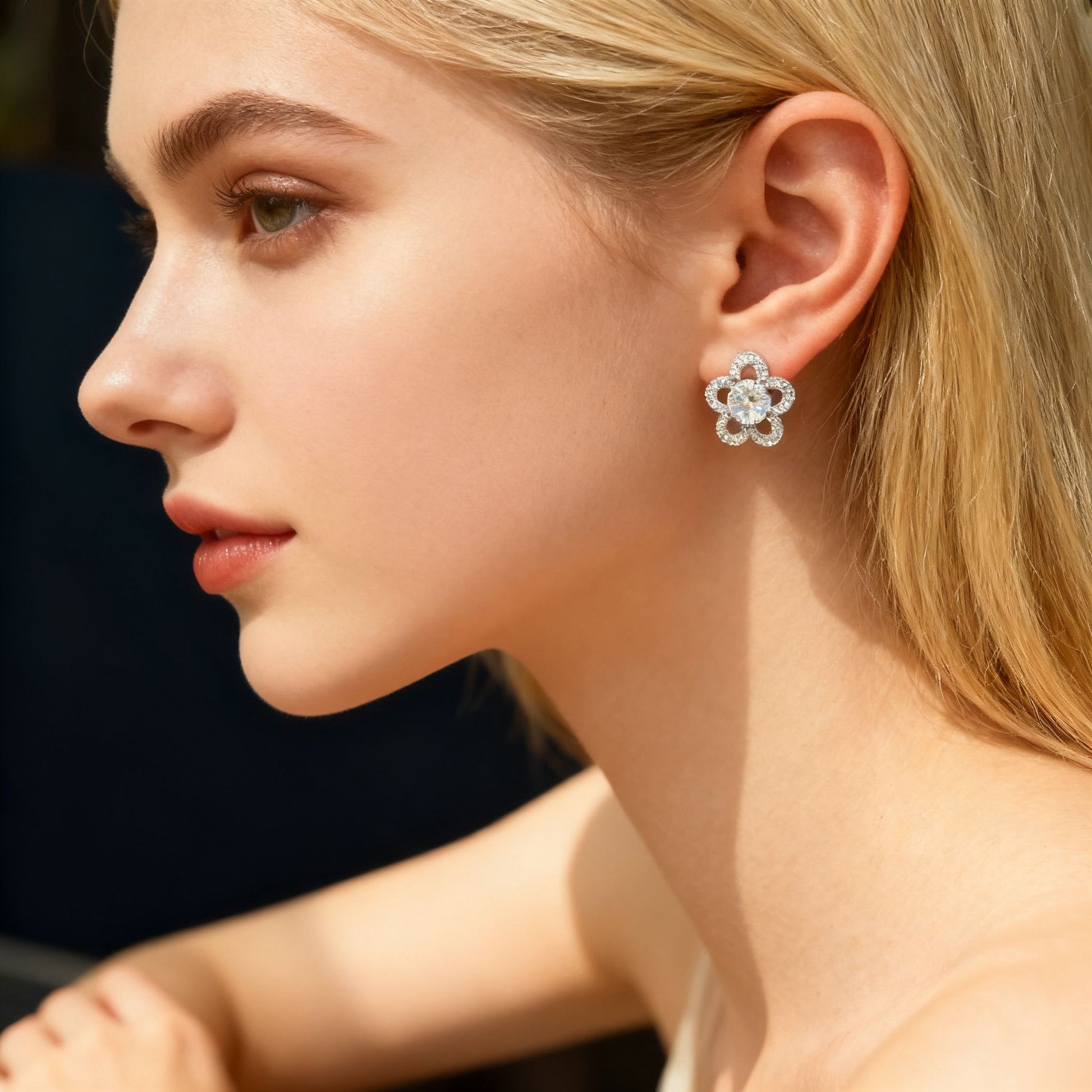 The ER16 Moissanite Diamond Earrings are designed to capture light like petals in full bloom. Each earring features a 1-carat moissanite diamond, framed by a delicate floral silhouette that sparkles from every angle. The openwork design gives it a light, airy feel — feminine yet powerful.