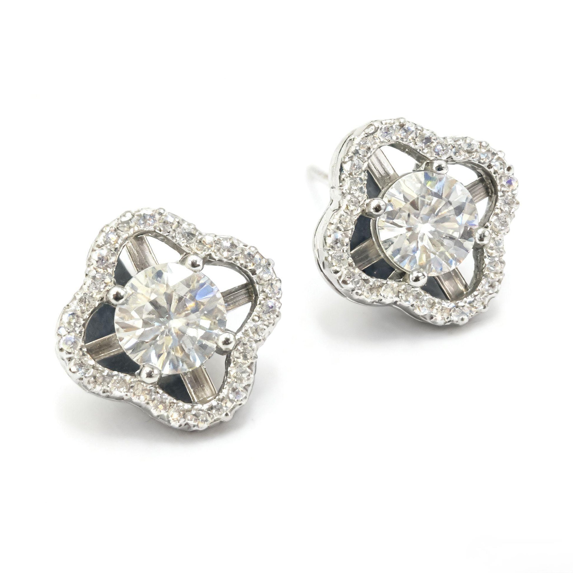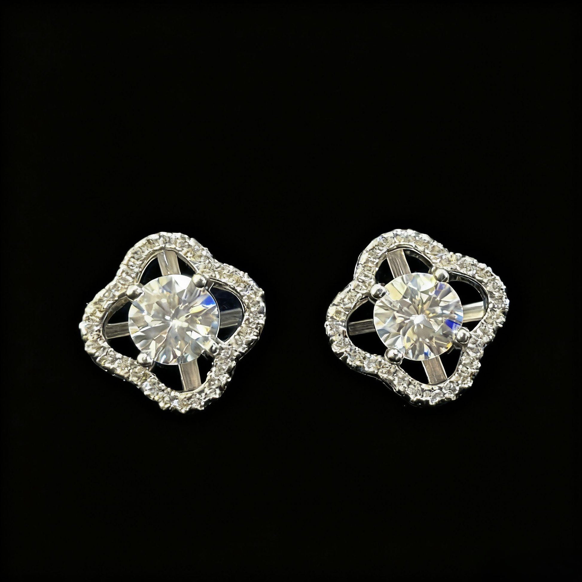 The ER37 Moissanite Diamond Earrings feature a stunning 1-carat moissanite diamond at the center, surrounded by a graceful four-leaf floral frame that symbolizes elegance, beauty, and good fortune. Each earring reflects light with every movement, radiating brilliance from every angle.