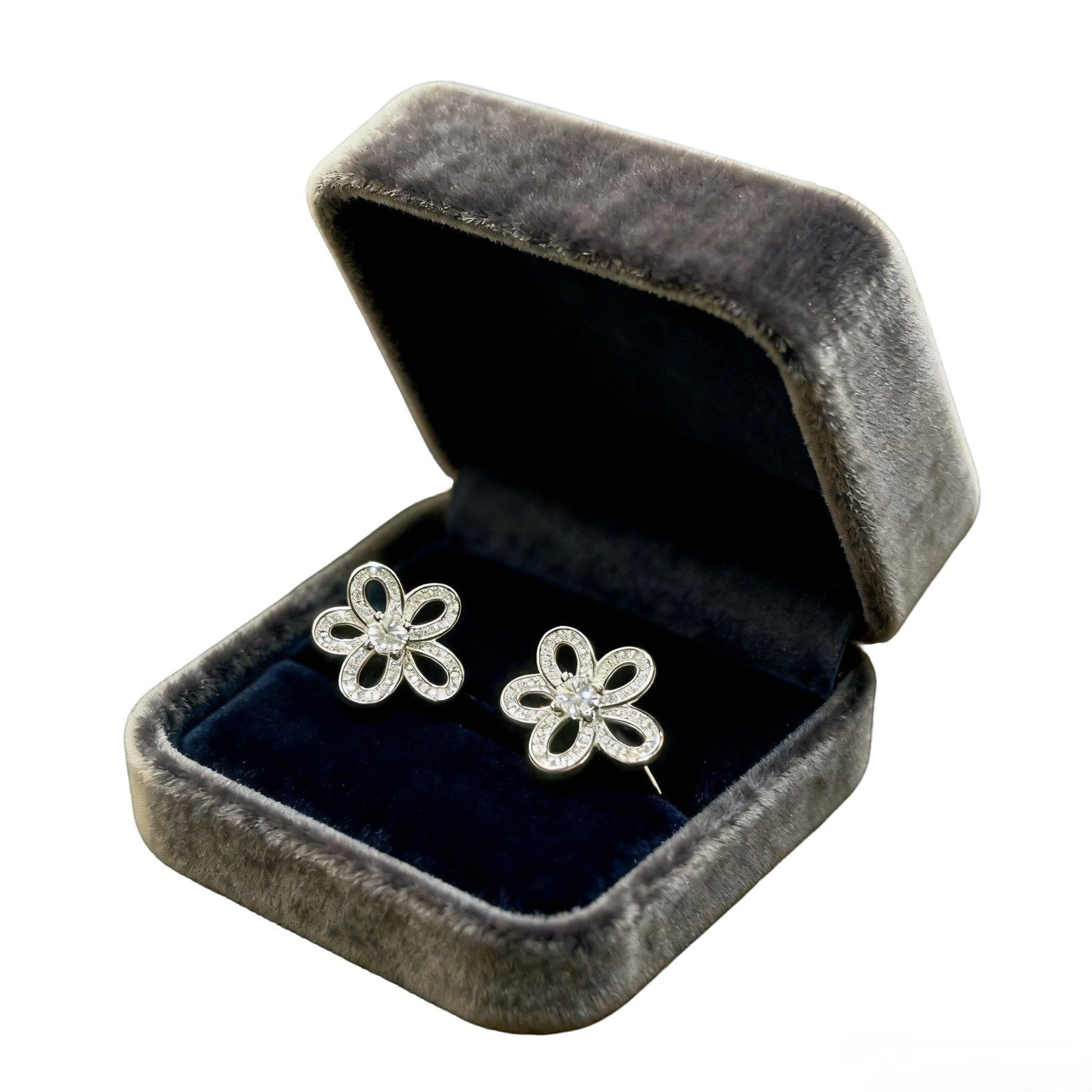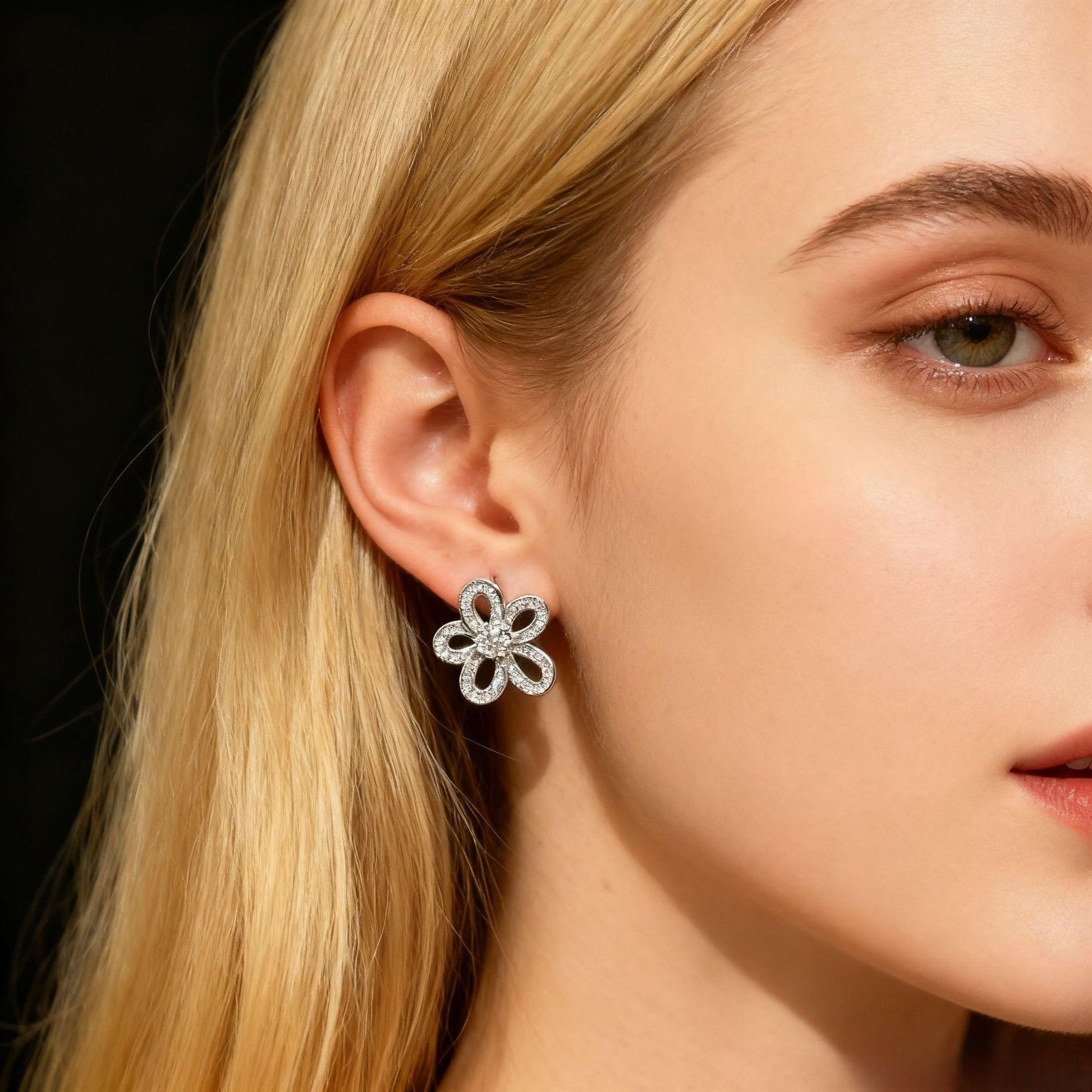 The ER62 Moissanite Diamond Earrings feature a delicate petal flower design, capturing the essence of feminine grace and timeless charm. Each earring is adorned with a 0.3-carat moissanite diamond that sparkles with pure brilliance — subtle yet captivating from every angle.