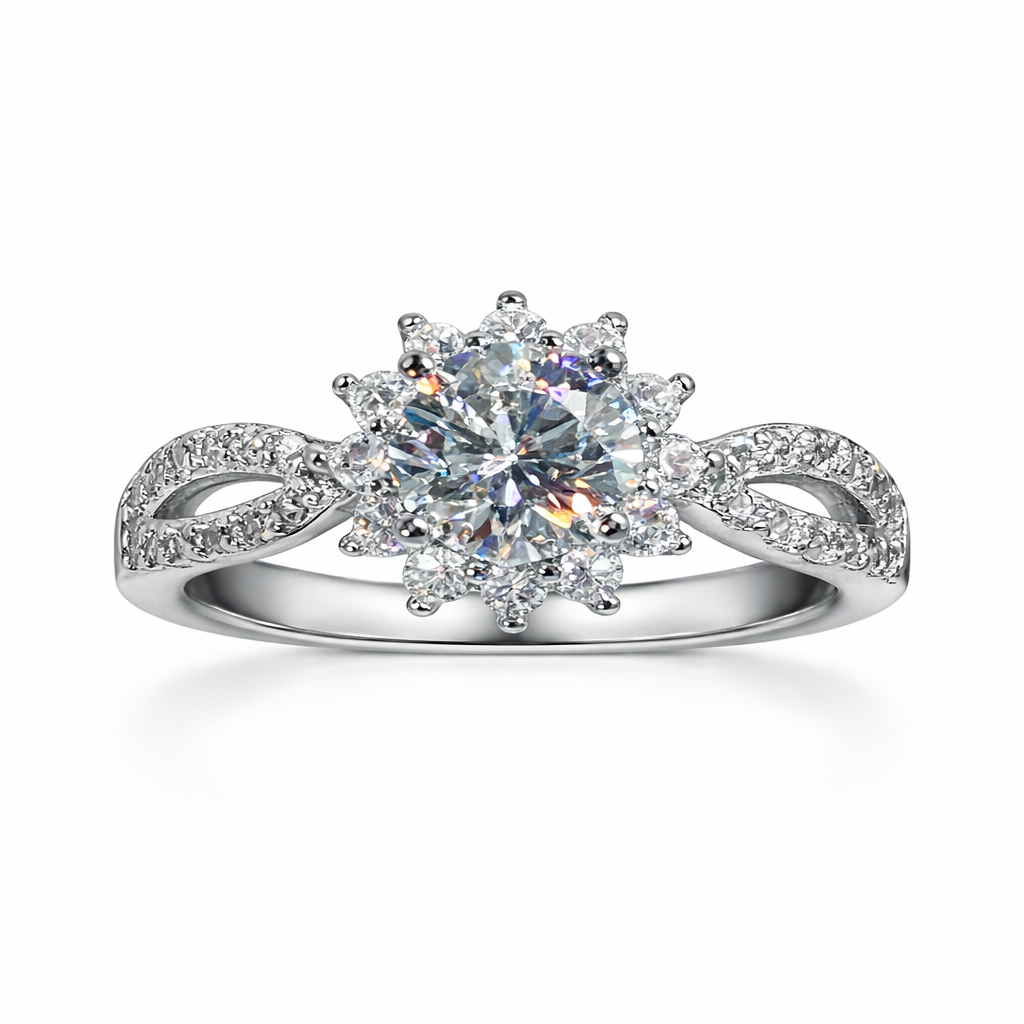 Designed to captivate at first glance, it features a brilliant round-cut center stone framed by a dazzling halo, creating a timeless floral silhouette that sparkles from every angle.