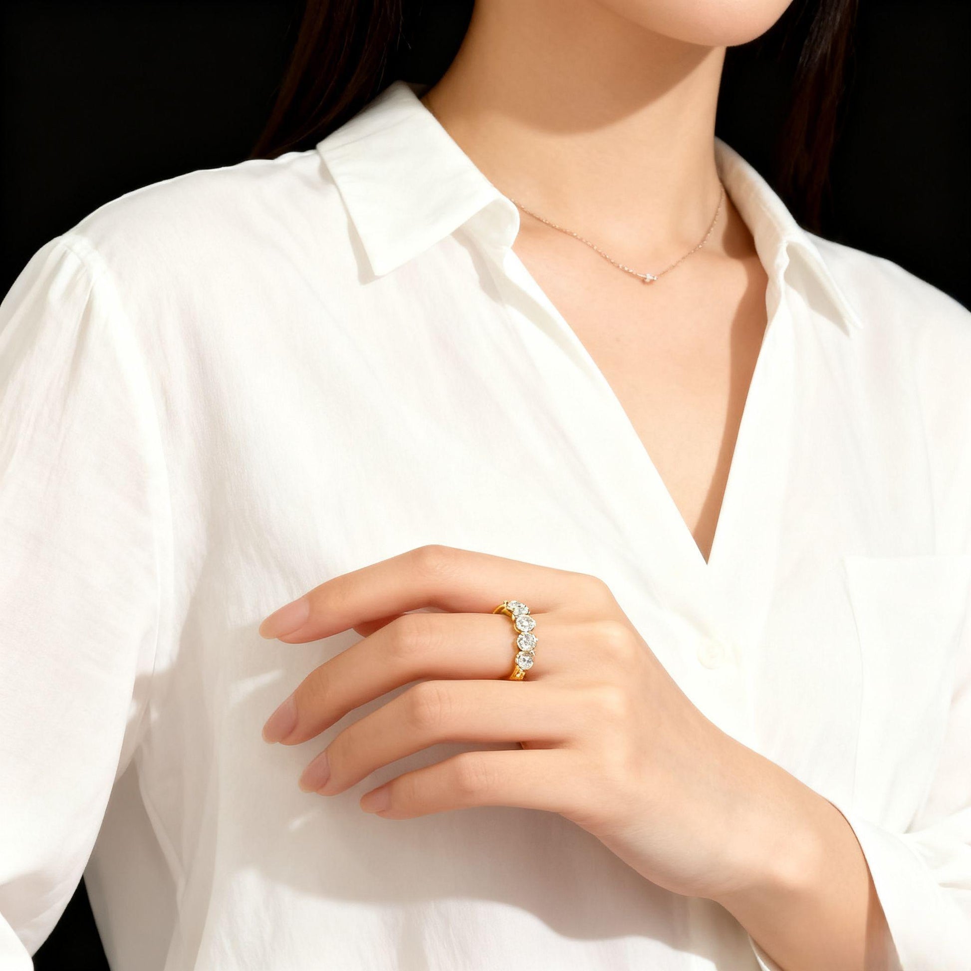 Crafted from S925 sterling silver plated in rich gold, this ring features a continuous row of brilliant-cut Moissanite stones, each hand-set to create a seamless circle of radiance.
