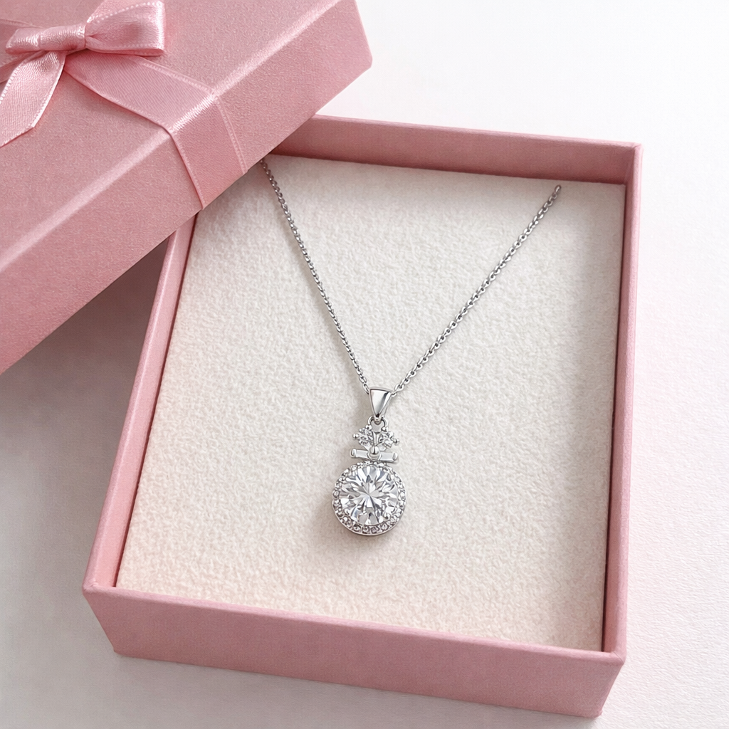This snowman-inspired necklace is a soft statement โ clean lines, balanced sparkle, and a design that feels warm, pure, and quietly charming.