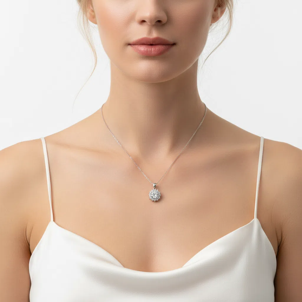 The XL28 1CT Moissanite Diamond Necklace embodies classic sophistication with a radiant floral halo design. At its heart lies a dazzling 1-carat moissanite, encircled by smaller stones that catch the light from every angle.