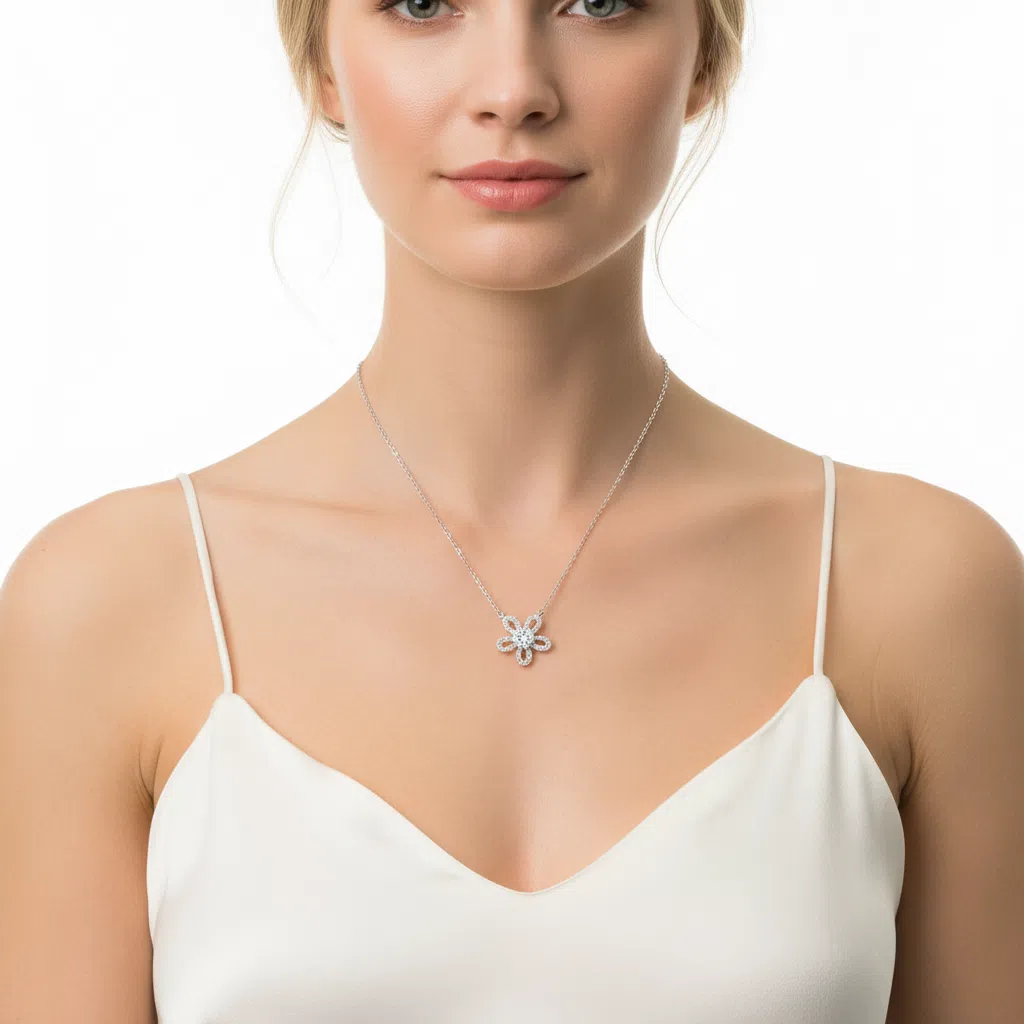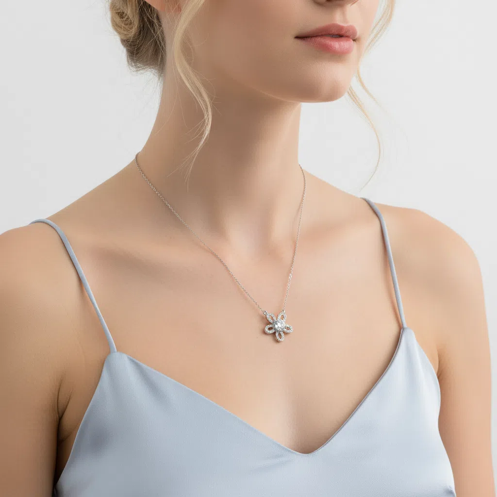 The XL41 1CT Moissanite Diamond Necklace embodies grace and good fortune in a timeless floral motif. Featuring a dazzling 1-carat moissanite at the center, surrounded by petal-like details, this piece radiates brilliance and femininity with every movement.